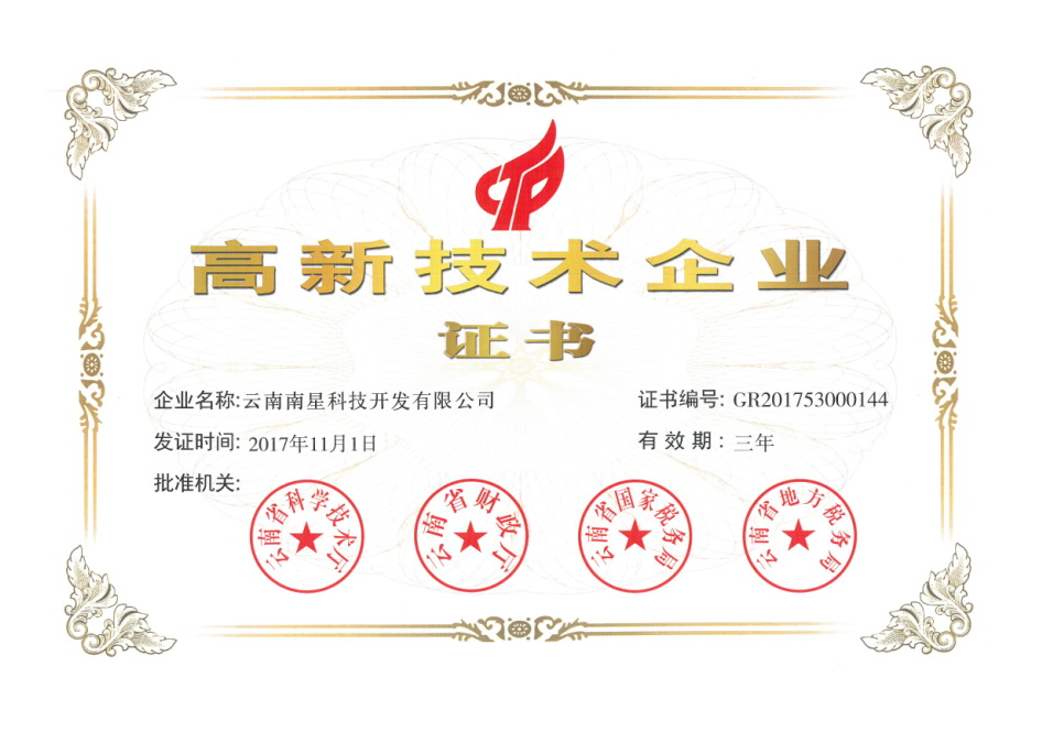 當(dāng)日,公司作為云南省2017年認(rèn)定的450家高新技術(shù)企業(yè)代表之一現(xiàn)場領(lǐng)到了證書編號GR201753000144高新企業(yè)證書及牌匾。