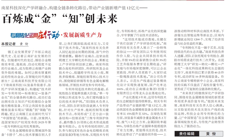 錫工業(yè)發(fā)展貫穿了半部云南近現(xiàn)代史,見(jiàn)證著云南礦業(yè)發(fā)展的歷程。但隨著時(shí)代的變遷,錫鉛合金精煉效率低、能耗高、自動(dòng)化程度不足的行業(yè)痛點(diǎn),成為阻礙云南錫產(chǎn)業(yè)轉(zhuǎn)型升級(jí)的難題。如何讓擁有厚重積淀的傳統(tǒng)冶金業(yè),在智能化時(shí)代煥發(fā)新生?云南南星科技開(kāi)發(fā)有限公司(下稱南星科技)從裝備升級(jí)著手,依托產(chǎn)學(xué)研深度融合,構(gòu)建起“技術(shù)研發(fā)—專利布局—標(biāo)準(zhǔn)制定—裝備產(chǎn)業(yè)化”的全鏈條轉(zhuǎn)化路徑,成功打造出擁有自主知識(shí)產(chǎn)權(quán)的錫鉛合金智能化精煉裝備,不僅讓我國(guó)有色金屬精煉裝備實(shí)現(xiàn)從“跟跑”到“領(lǐng)跑”的跨越,更讓云南錫工業(yè)在新時(shí)代寫下“中國(guó)智造”的新篇。日前,該案例入選國(guó)家知識(shí)產(chǎn)權(quán)局發(fā)布的2025年第一批專利轉(zhuǎn)化運(yùn)用優(yōu)秀案例。