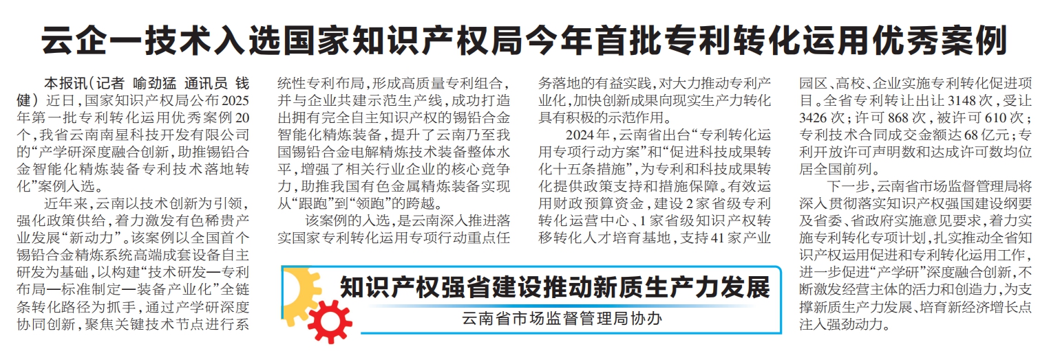 本報(bào)訊(記者 喻勁猛 通訊員 錢健) 近日,國(guó)家知識(shí)產(chǎn)權(quán)局公布 2025 年第一批專利轉(zhuǎn)化運(yùn)用優(yōu)秀案例 20 個(gè),我省云南南星科技開(kāi)發(fā)有限公司的“產(chǎn)學(xué)研深度融合創(chuàng)新,助推錫鉛合金智能化精煉裝備專利技術(shù)落地轉(zhuǎn)化”案例入選。